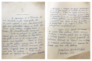 Uma carta escrita pelo ex-presidente Juscelino Kubitschek foi encontrada por acaso no Museu Histórico e Geográfico de Poços de Caldas, Sul de Minas. O documento, datado de 1961, época do fim de seu mandato presidencial, veio à tona durante um processo de reorganização do acervo conduzido pela estagiária de Museologia Jussara Soares, trazendo consigo parte da memória política do país.