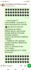 “Vamos jogar??? Polícia Federal, vocês têm 72 horas para desarmar a bomba que está na casa dos comunistas de merda”, disse, em capturas de tela de celular publicadas em sua página no Facebook.